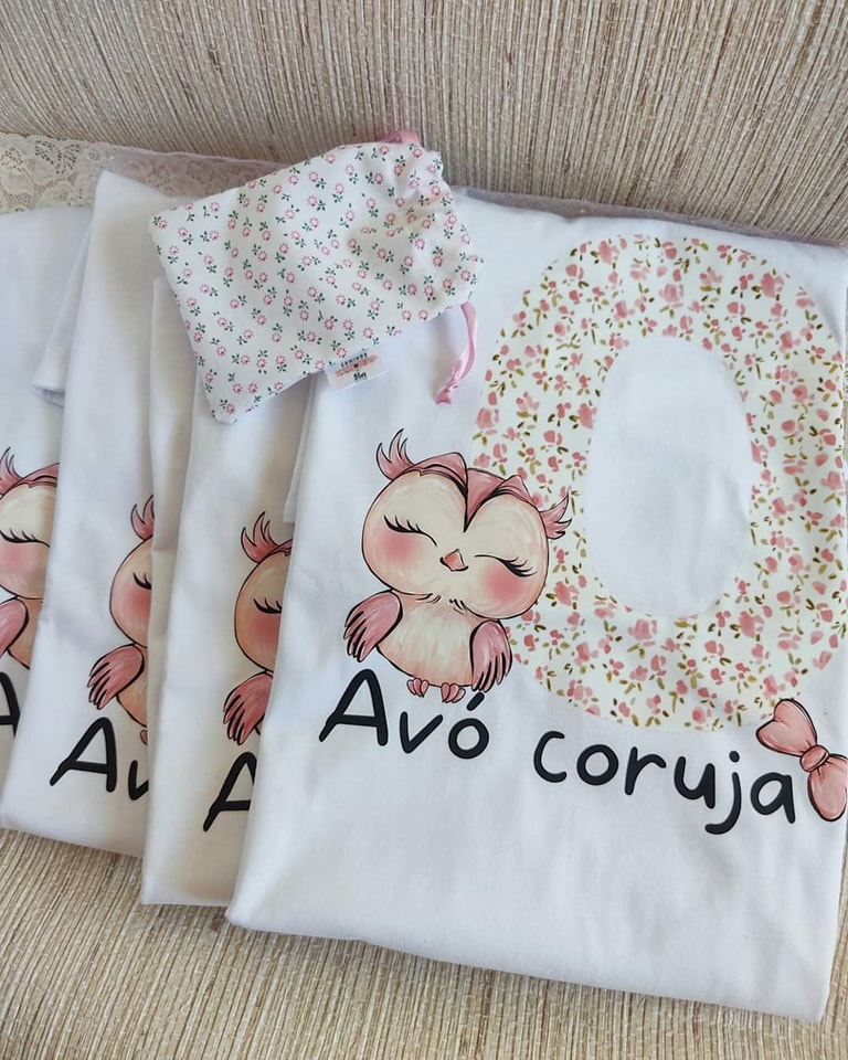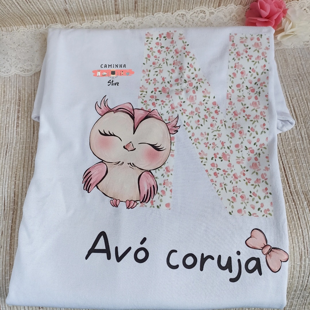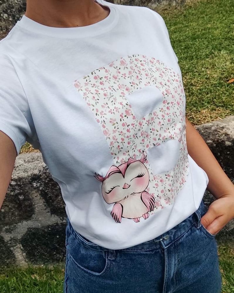 T-shirt personalizada corujinha. Imagens Ilustrativas. Escolhe o teu texto, quantas corujinhas desejas, cores, com ou sem inicial.